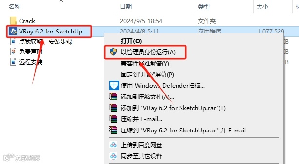 4.鼠标右击【VRay 6.2 for SketchUp】安装程序,选择【以管理员身份运行】。