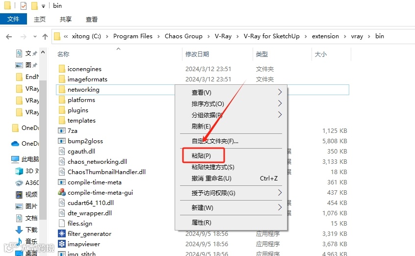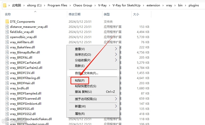 34.在打开的文件夹空白处,鼠标右击选择【粘贴】之前复制的vray_BRDFScanned.dll文件。