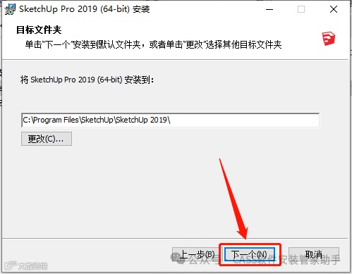 7.可以保持默认安装路径,也可以点击【更改】自行设置安装路径,点击【下一个】。温馨提示:草图大师最好安装在默认路径,这样有利于以后安装插件和Vray渲染激活,不然可能会导致安装激活失败。