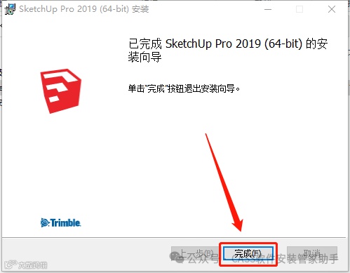 10.安装好后点击【完成】,此时安装好的SketchUp 2019软件为试用版,接下来开始破解。
