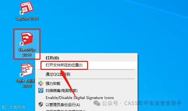 13.在桌面上找到SketchUp 2019软件图标,鼠标右击选择【打开文件所在的位置】。