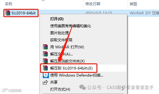 1.下载SketchUp 2019安装包,鼠标右击压缩包选择【解压到SU2019-64bit】。