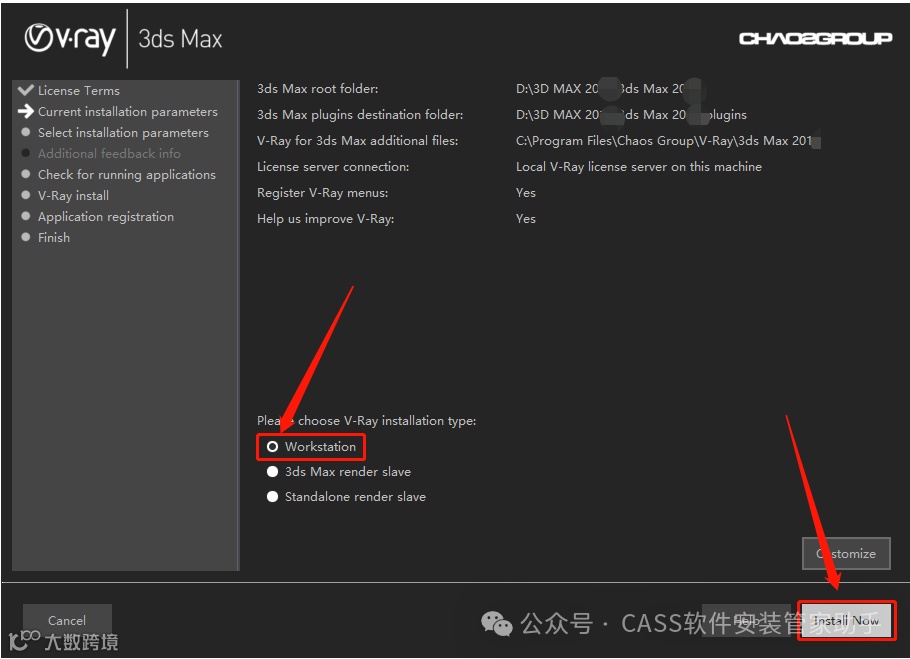 5.软件默认识别自己电脑上安装的3dmax路径,选择【Workstation】,然后点击【Install Now】。