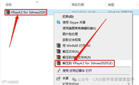 1.打开下载的VRay软件安装包,鼠标右击压缩包选择【解压到VRay4.2 for 3dmax2020】。