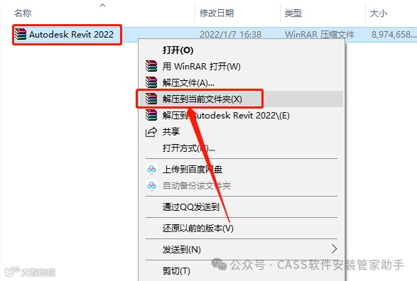 1.下载软件安装包,鼠标右击Revit 2022压缩包,选择【解压到当前文件夹】。