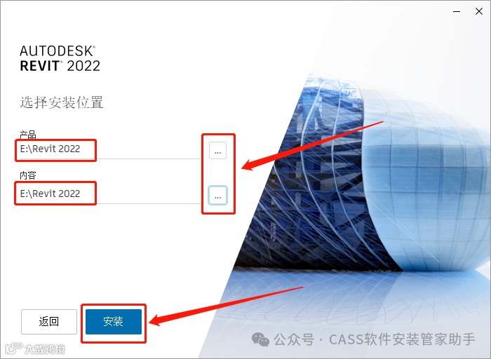 7.分别点击【···】设置revit2022软件的安装路径,建议安装到除C盘以外的磁盘,教程中选择直接安装到E盘,并在E盘里新建了一个名为Revit2022的文件夹,设置好安装路径后点击【下一步】。