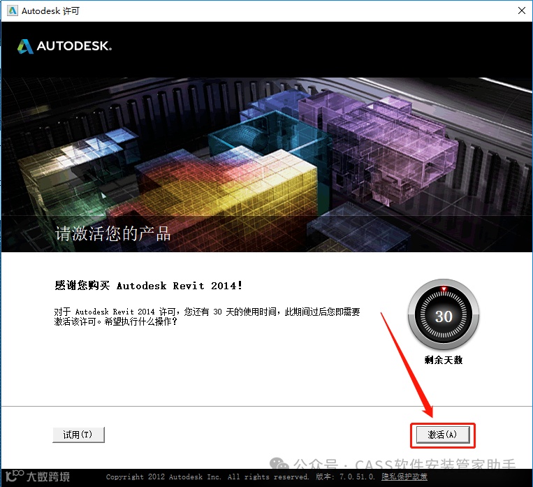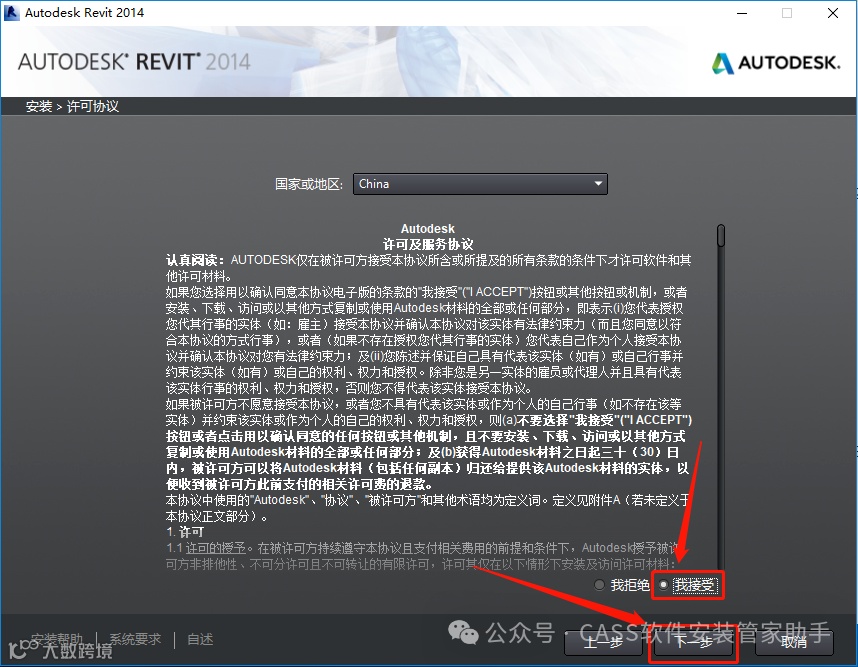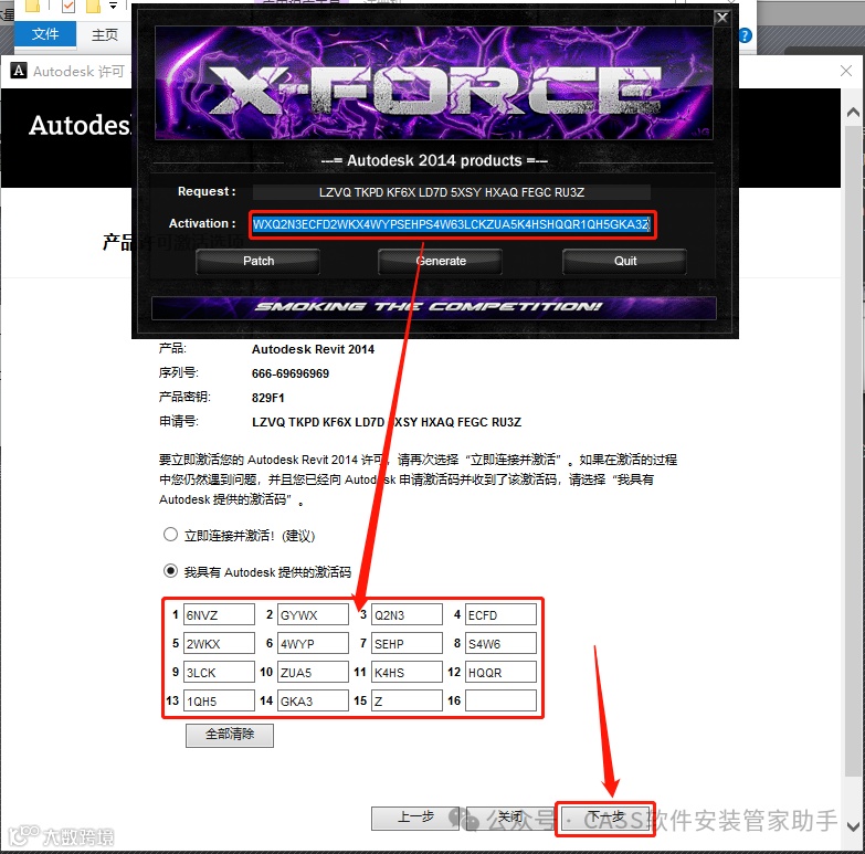 28.全部选中Activeation中生成的激活码(仔细检查是否复制完整),使用Ctrl+C键或者鼠标右击复制生成的激活码,然后粘贴激活码至我具有Autodesk提供的激活码方框中,最后点击下一步.