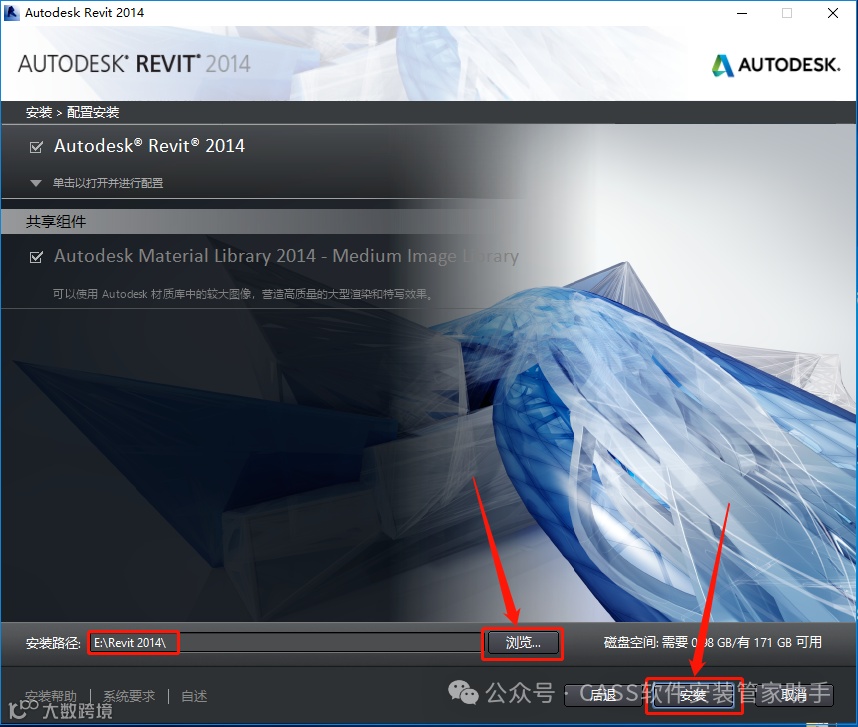 9.点击【浏览】设置软件的安装路径,建议安装到除C盘以外的磁盘,可在E盘或其它盘里面新建一个【Revit 2014】的文件夹,设置好安装路径后点击【安装】。