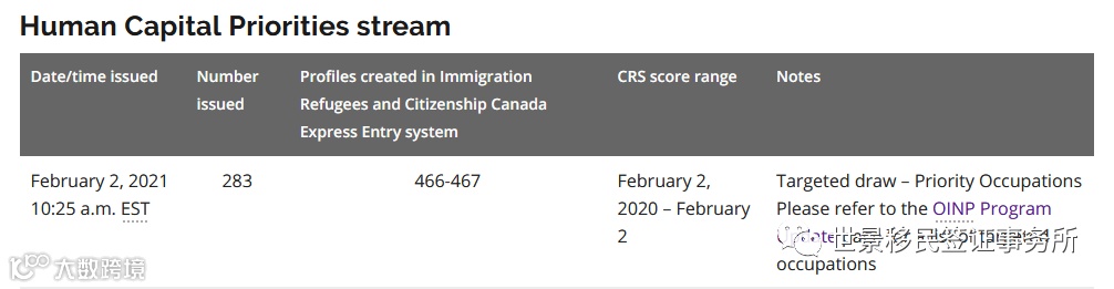 2021年的2月2日,安省提名的优才类别进行了本年度的首次筛选,距离上次在2020年12月15日的优才类筛选过去了一个半月。本次筛选共有283位申请人以466-467分的联邦EE得分获得安省的筛选,这意味着他们在获得安省提名的600分加分后,将一定会获得联邦EE的移民申请邀请(ITA)。