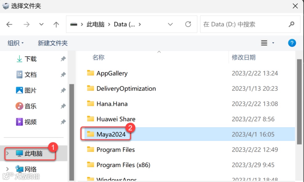 7.①选择需要将软件安装的磁盘(如:D盘)②新建一个【Maya2024】并选中③点击【选择文件夹】。