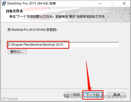 7.保持默认安装路径,也可以自行设置安装路径,然后点击【下一个】。温馨提示:草图大师最好安装在默认路径,这样有利于以后安装插件和Vray渲染激活,不然可能会导致安装激活失败。