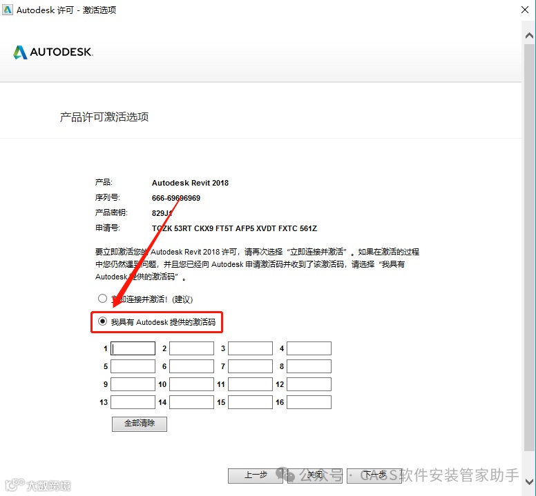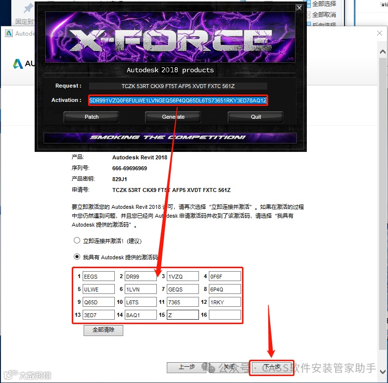 29.全部选中Activation中生成的激活码,使用Ctrl+C键或者鼠标右击复制生成的激活码,然后粘贴激活码至我具有Autodesk提供的激活码方框中,点击【下一步】。