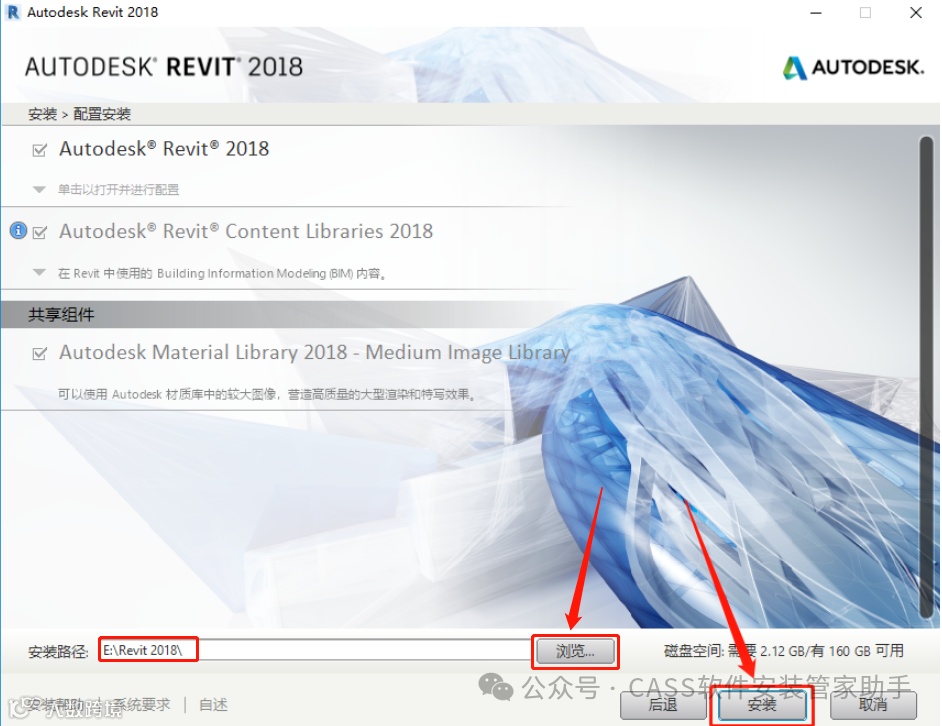 9.点击【浏览】设置软件的安装路径,建议安装到除C盘以外的磁盘,可在E盘或其它盘里面新建一个【Revit 2018】的文件夹,设置好安装路径后点击【安装】。