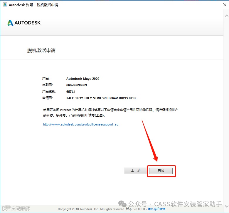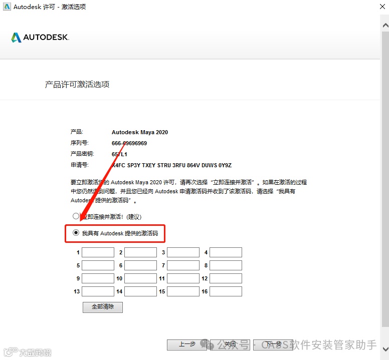 29.全部选中Activeation中生成的激活码(仔细检查是否复制完整),使用Ctrl+C键或者鼠标右击复制生成的激活码,然后粘贴激活码至我具有Autodesk提供的激活码方框中,最后点击下一步