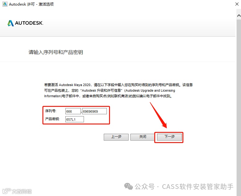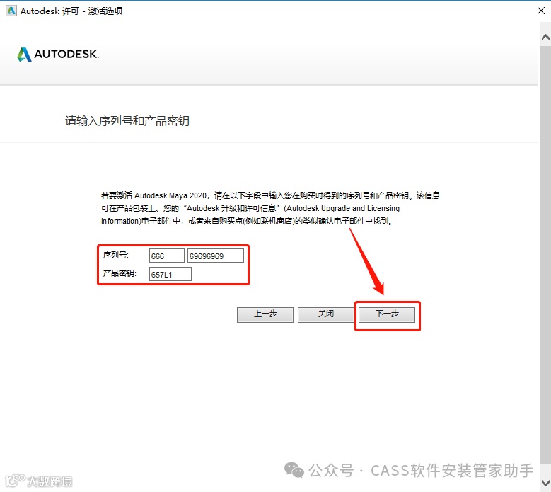 22.输入序列号:666-69696969,667-98989898,400-45454545,066-66666666,产品密钥:657L1,输入好后点击【下一步】