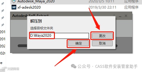 4.点击【更改】设置软件安装包的解压路径,可以在D盘创建一个名为【Maya2020】的文件夹,设置好解压路径后点击【确定】
