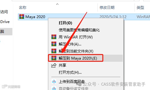 1.下载软件安装包,鼠标右击压缩包选择【解压到Maya 2020】