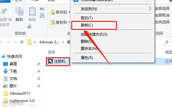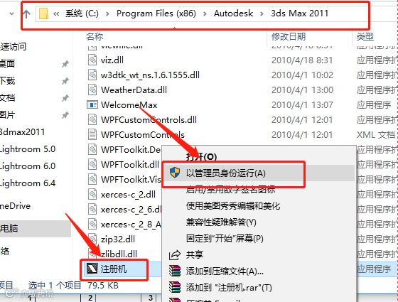 29.返回到软件的安装路径3ds Max 2011文件夹,找到之前粘贴的注册机,鼠标右击选择【以管理员身份运行】。