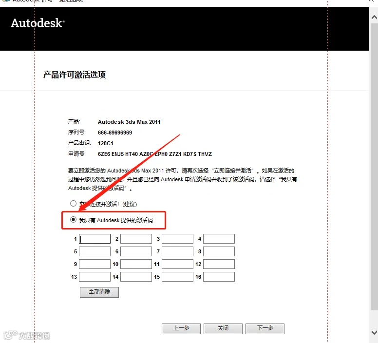 34.选中注册机中Activation方框中生成的激活码,使用ctrl+C键或者鼠标右击选择复制,然后把复制的激活码使用ctrl+V键粘贴至我具有Autodesk提供的激活码方框中,粘贴好后点击【下一步】。