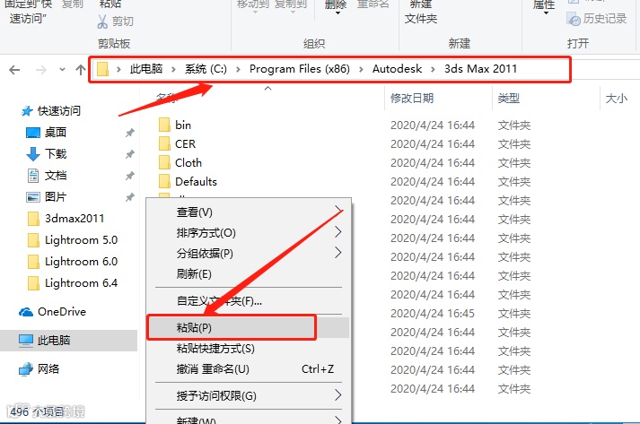 13.打开软件的安装路径(3ds Max 2011),默认为安装路径为C盘的话,打开C:\Program Files\Autodesk\3ds Max 2011,然后在打开的3ds Max 2011文件夹空白处,鼠标右击选择【粘贴】。