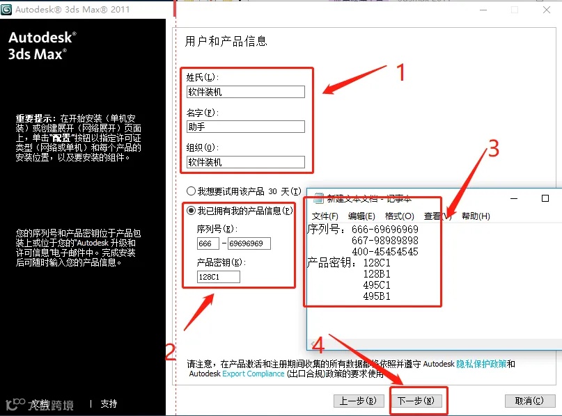 7.填写姓氏、名字和组织(可随便填写),然后选择我已拥有我的产品信息填写,文本中的序列号和产品密钥,填写好后点击【下一步】。