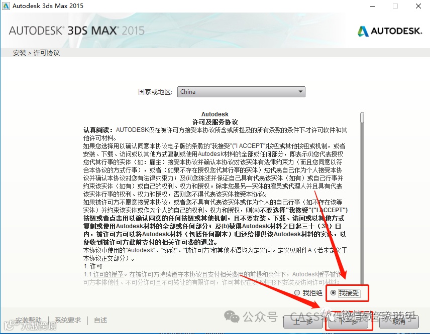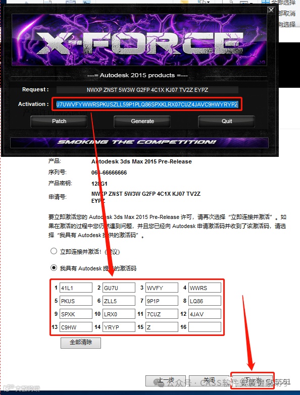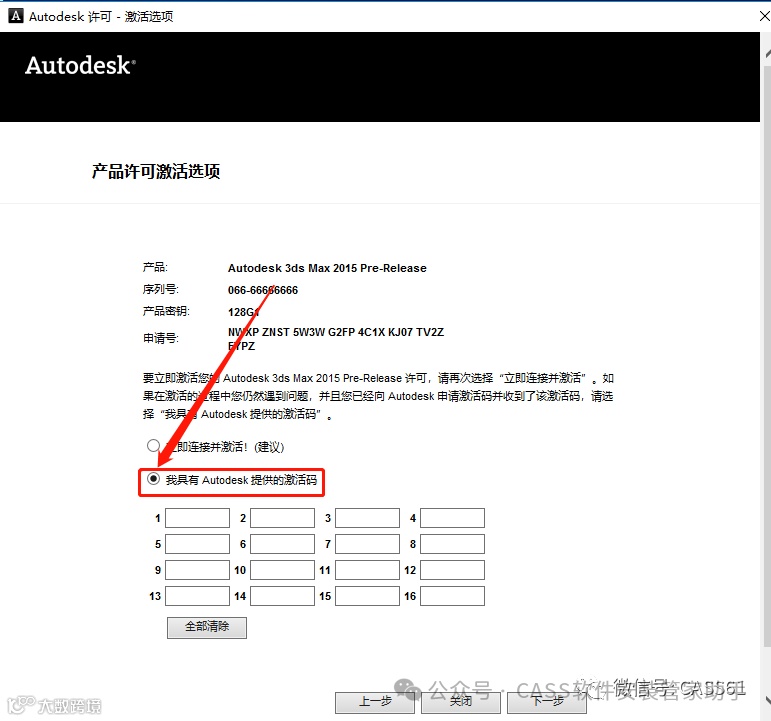 24.选中注册机中Activation方框中生成的激活码,使用ctrl+C键或者鼠标右击选择复制,然后把复制的激活码使用ctrl+V键粘贴至我具有Autodesk提供的激活码方框中,粘贴好后点击【下一步】。