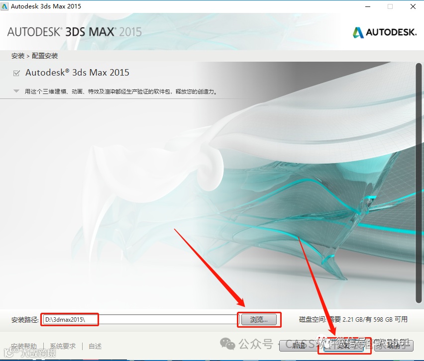 9.点击【浏览】设置3dmax2015的安装路径,建议安装到除C盘以外的磁盘,设置好安装路径后点击【安装】。