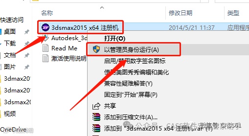 19.返回到解压的文件夹,鼠标右击【3dsmax2015_x64注册机】程序,选择【以管理员身份运行】。