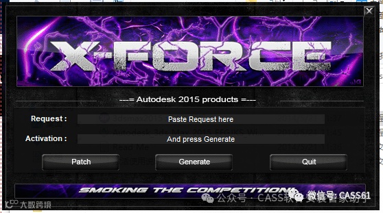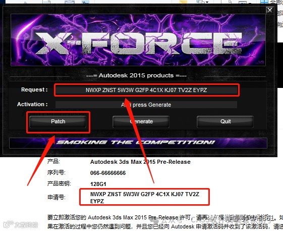 21.使用ctrl+C键复制申请号,然后使用ctrl+V键粘贴至注册机中的Request方框中,粘贴好后点击注册机左下角的【Patch】。