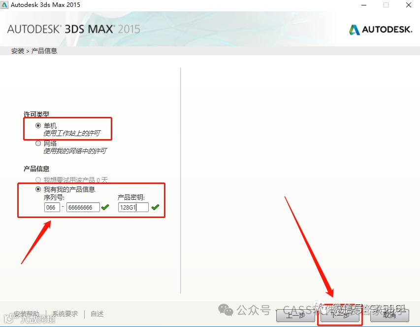 8.许可类型选择单机,然后输入序列号:066-66666666,密钥:128G1,输入好后点击【下一步】。