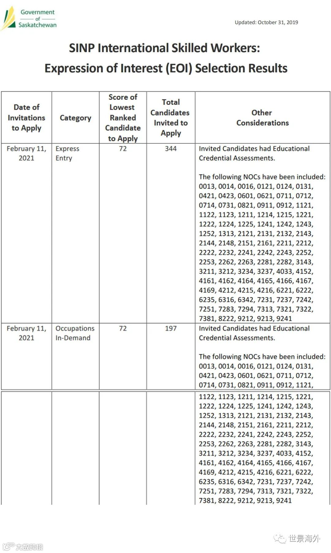 2.11|加拿大萨省技术移民EOI最新筛选:邀请541人,最低72分