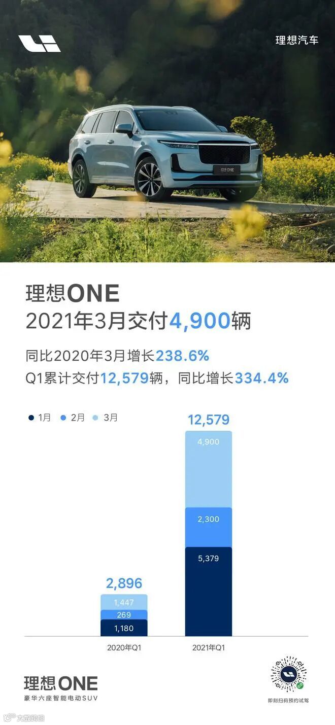 4月2日,理想汽车公布了3月交付数据。理想ONE在3月交付4900辆,同比2020年3月增长238.6%,环比2021年2月增长113%。2021年第一季度,理想汽车累计交付12579辆,同比增长334.4%。