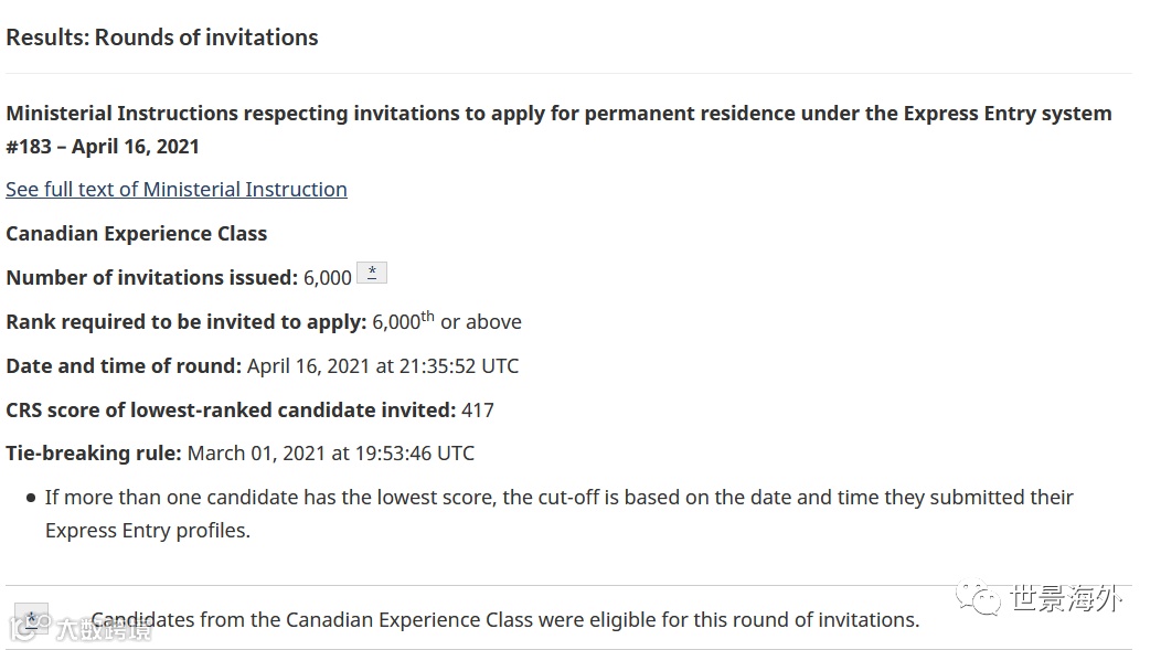 加拿大时间2021年04月16日,EE进行了最新一次加拿大技术移民筛选,本次筛选加拿大经验类别,获邀最低分为417分,获邀人数为6000。