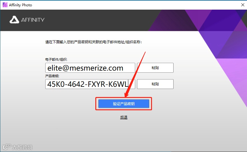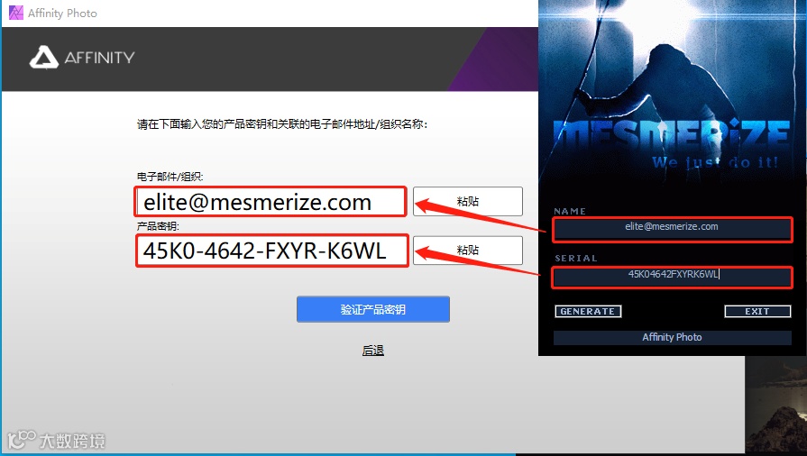 11.使用Ctrl+C快捷键复制注册机中的【NAME】和【SERIAL】,使用Ctrl+V快捷键分别粘贴至【电子邮件··】及【产品密钥】。