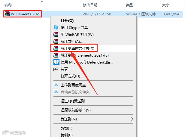 1.下载【Pr Elements 2021】软件安装包,鼠标右击压缩包选择【解压到当前文件夹】。