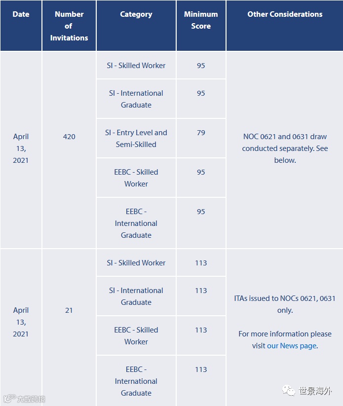 BC省技术移民项目针对NOC 0621、0631之外的岗位,邀请了420人,其中BC省快速通道-技术工人类(EEBC)最低邀请分95分;BC省快速通道-留学生类(EEBC)最低邀请分95分。