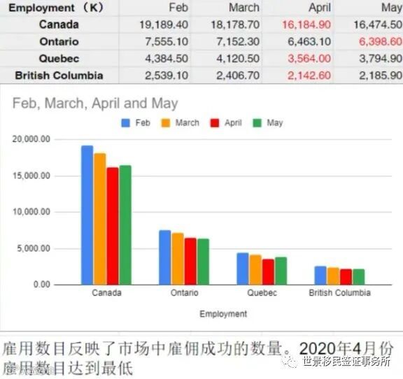 第一个是我们整个加拿大范围之内的雇佣的数量,也就是说我们可以看到在3月份4月份加拿大的岗位失去了差不多200万个岗位,那么同时在5月份又回升了差不多30万个岗位,这些数据可以很好地反映它整体的就业市场的数量。