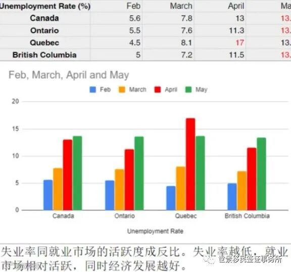 同时另一个表格是显示的是加拿大的失业率,在不同的省份可能失业率不太一样,但是失业率越高的话,说明它的就业市场越不好。