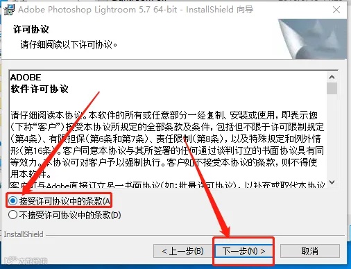 7.选择【接受许可协议中的条款】,点击【下一步】。