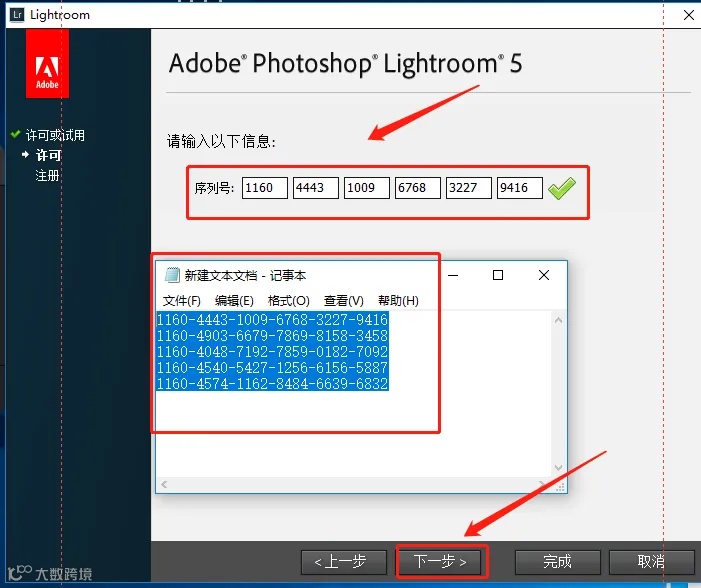 13、复制任意一行数字粘贴到序列号栏中,点击下一步。