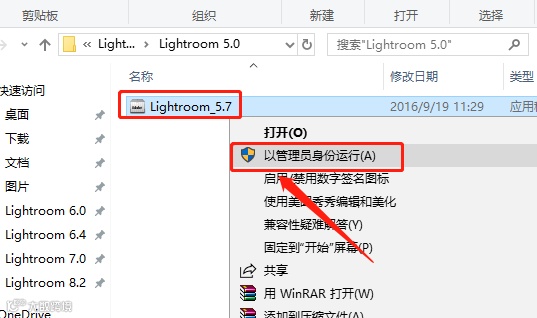 2.打开【Lightroom 5.7】文件夹,鼠标右击安装程序,选择【以管理员身份运行】。