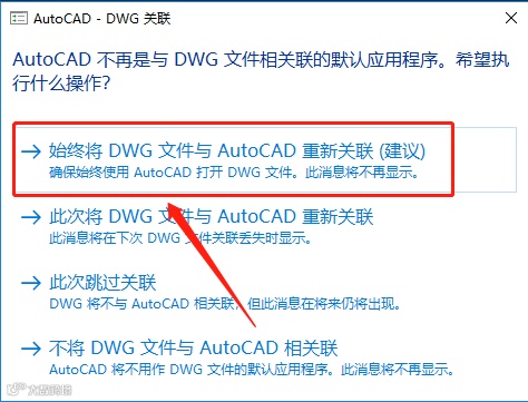 18.若出现下图所示的界面,直接点击【始终将DWG文件与AutoCAD重新关联】(若没有该界面直接忽略)。