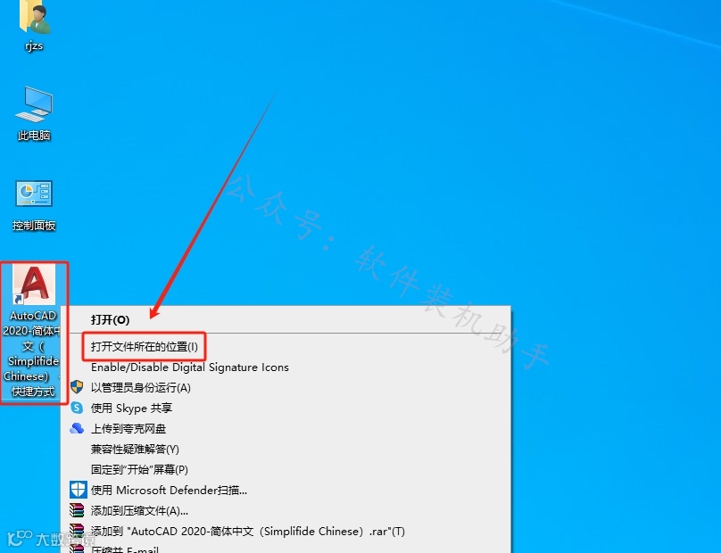 14.在桌面上找到AutoCAD 2020软件图标,鼠标右击点击【打开文件所在的位置】。