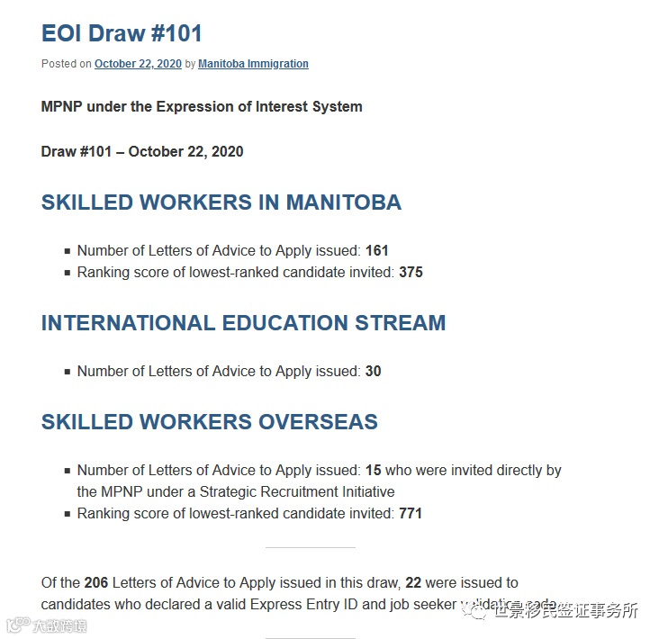 曼省发布了新的技术移民筛选结果,此次分别邀请了曼省境内申请人类别境外申请人类别以及国际毕业生类别的候选人,其中境内申请人类别最低邀请分375分,邀请人数161人;境外申请人类别最低邀请分771分,邀请人数15人;国际毕业生类别邀请人数30人。