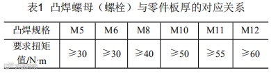 为保证焊接质量的稳定,对凸焊螺母(螺栓)与零件板厚的对应关系要求见表1。