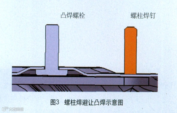 要点四:在同一个板件既有凸焊又有螺柱焊的情况下,因为板件一般是凸焊在先螺柱焊在后,故螺柱焊螺钉的中心距凸焊螺栓或凸焊螺母的边沿长度应大于螺柱焊枪枪口的外半径15mm。