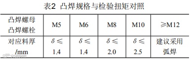 凸焊检验一般包括焊接强度检验与安装性能检验,其中安装性能检验一般为目视检验,若目视不能确认,则利用与凸焊螺母(螺栓)进行匹配的螺栓(螺母)进行现场实配,检验其安装性能;焊接强度的检验是通过扭矩扳手来检验凸焊强度是否达到工艺要求值(见表2),如未达到规定扭矩值就已脱落,则应重新调整焊接参数直到强度检验合格为止。