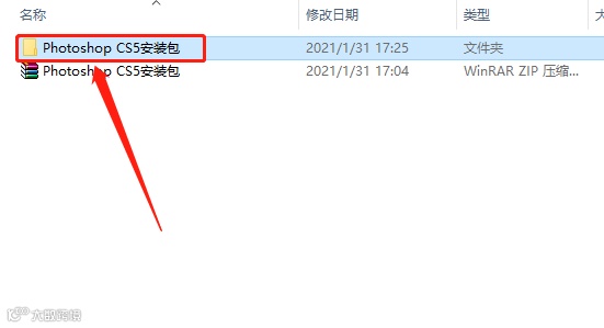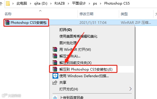 1.下载ps cs5软件安装包,鼠标右击压缩包选择【解压到Photoshop CS5】。