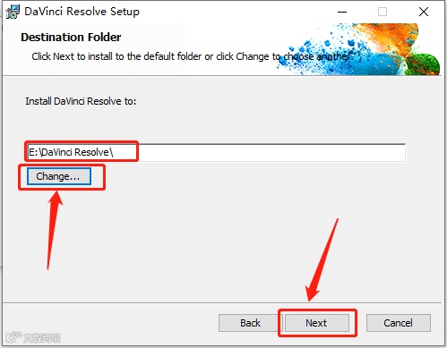 10.点击【Change】可设置达芬奇12软件的安装路径,可自行设置,教程中是安装在E盘新建的文件夹中(安装路径不要出现中文),设置好安装路径后点击【Next】。