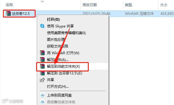 1.打开下载的达芬奇软件安装包,鼠标右击压缩包选择【解压到当前文件夹】。